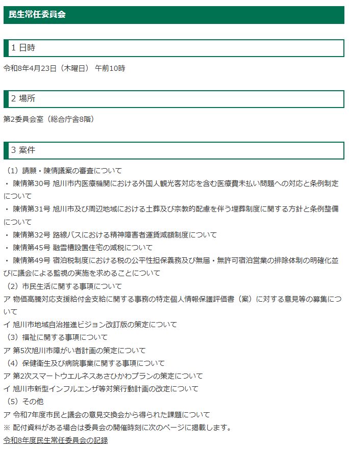 これ、私のです。無事に「民生常任委員会」に付託されたようですね。そこで民生常任委員会の会議日程を確認したところ、次の会議はこのブログ記事を公開した4月23日とのこと。